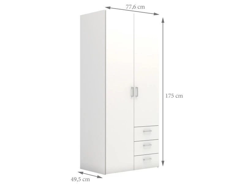 Armoire 2 portes et 3 tiroirs 77,6 x 175,4 x 49,5, Structure en tôle mélaminée, Blanc