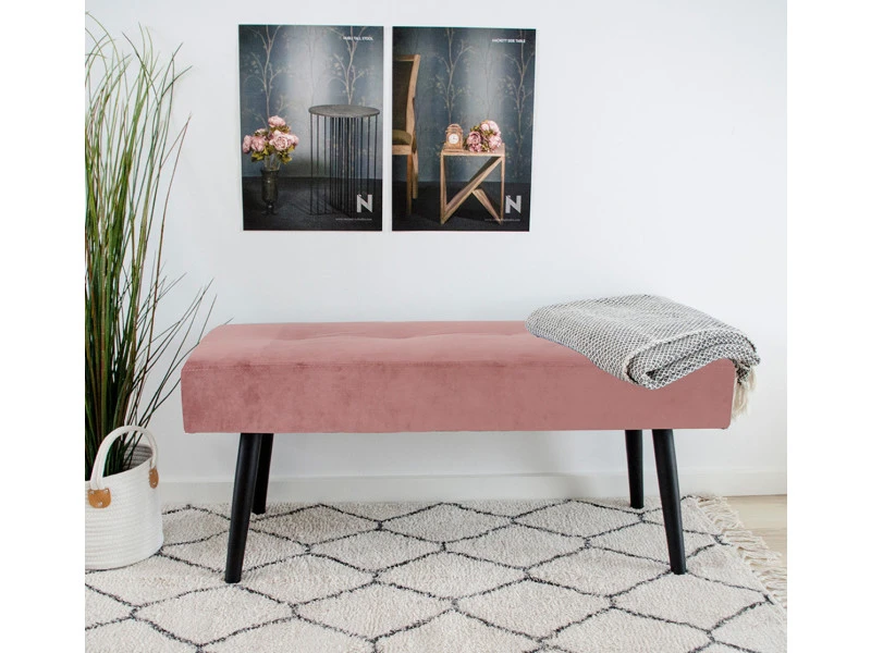 Banc en tissu coloris Rose. Style scandinave. Assise capitonnée. Revêtement en velours. Piètement conique en bois noir. Dimensions : 100 x 44 x 35 cm. Coloris : Rose. Matière : velours. Poids : 6.10 KG