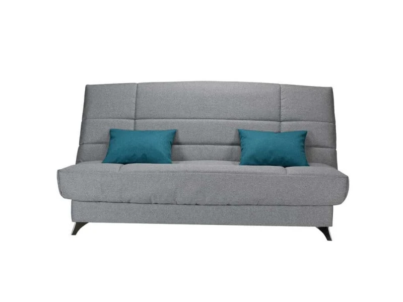Pour une solution gain de place efficace ce canapé clic-clac propose un coffre de rangement où couettes, housse et coussins prendront place.