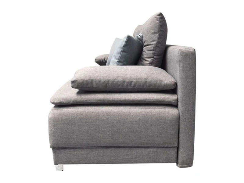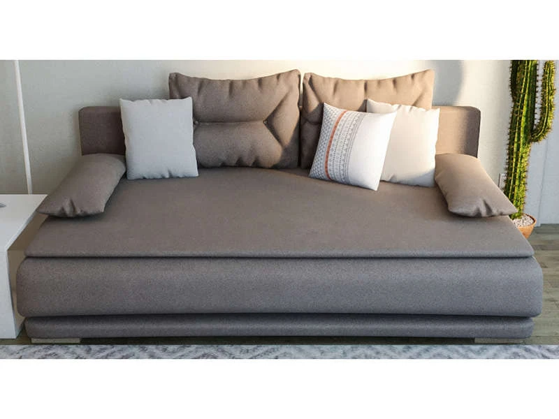 Alliez design, fonctionnalité et bien-être dans votre intérieur avec cette banquette-lit deux places en tissu gris et bleu. Ses coussins dossiers capitonnés, ses coussins déco inclus et son garnissage en mousse généreux assurent un confort moelleux. Pratique, il se déploie en un geste en un couchage confortable pour deux personnes. Son coffre permet un rangement optimal. Ce produit a été pensé et conçu pour le respect de l’environnement.