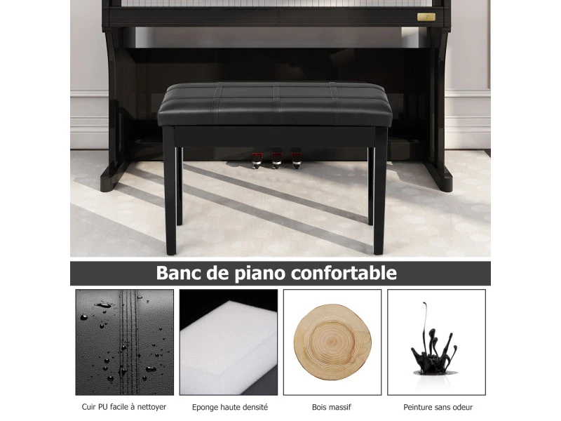 - ăStructure solide :ăCette banquette piano est fabriquĂ©e en bois massif de qualitĂ© avec un cuir PU (polyurĂ©thane). Les pieds en bois massif assurent un appui solide et la rĂ©sistance de la banquette. Chaque pied est pourvu d’un patin antidĂ©rapant qui protĂšge le sol.