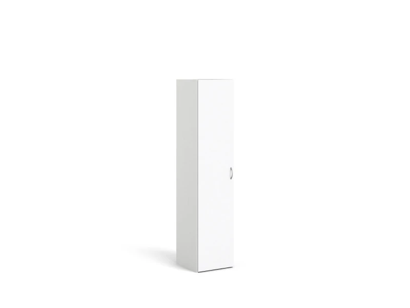 Armoire avec une seule porte battante et trois étagères intérieures, entièrement blanche.