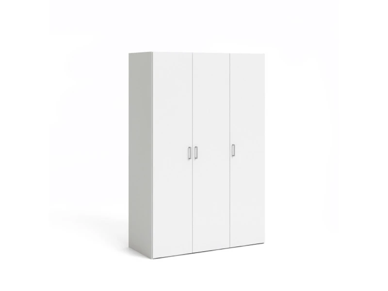 Armoire avec trois portes et quatre étagères internes avec barre de penderie dans les deux portes centrales.