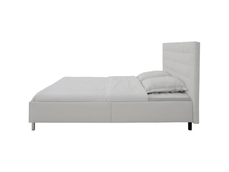 Lit 180×200 cm avec tete de lit revetement PU coloris Blanc – Structure Panneaux de particules, bois dur, isorel – Garnissage mousse polyĂ©ther densitĂ© 16 kg/m3 – Ouate 350 g/m² et 200 g/m² – Revetement 65% PU 21% Polyester 14% Coton