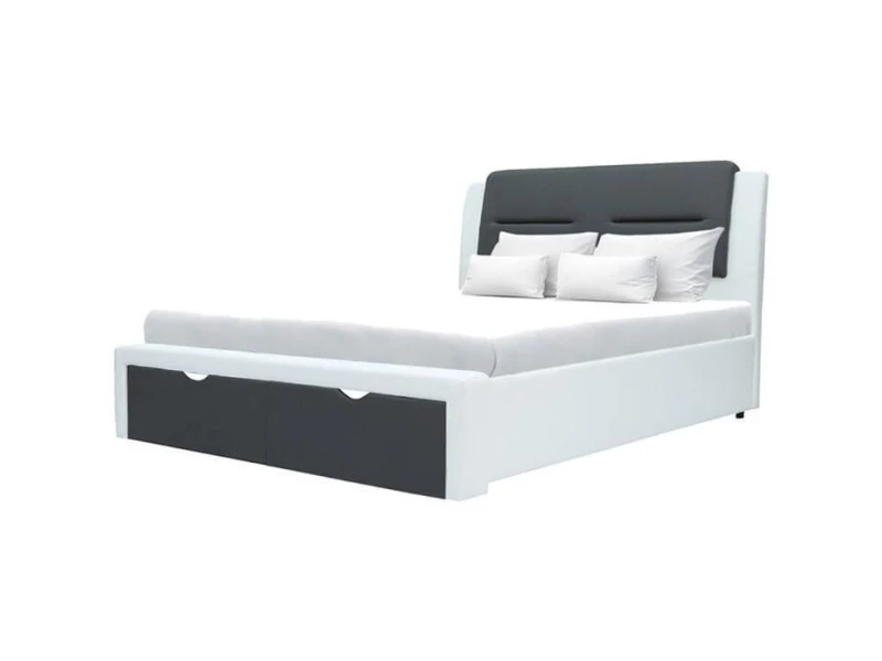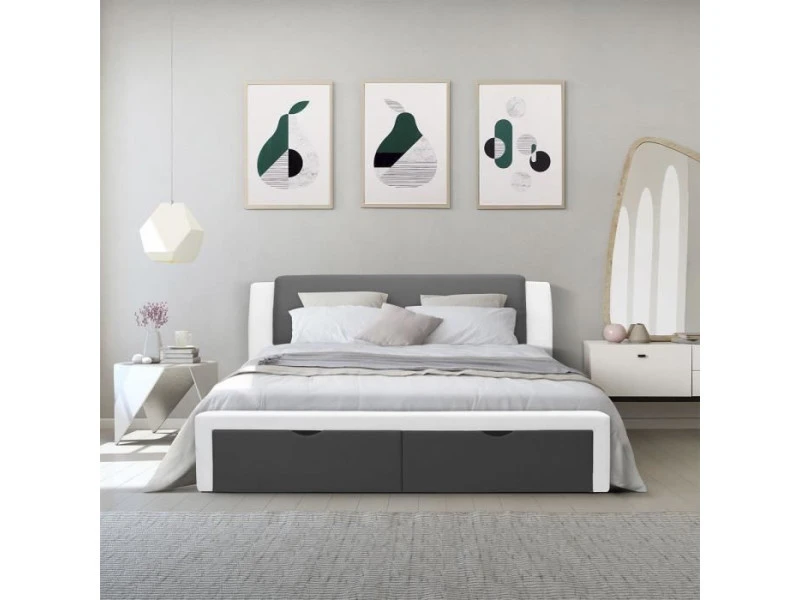 SCARLETTE Lit adulte contemporain avec 2 tiroirs de rangement – Structure en panneaux de particules – Pieds en plastique – Revetement Simili Gris foncĂ©/blanc – Couchage : 140 x 190 cm – Sommier a lattes inclus – LivrĂ© sans matelas – Dimensions totales :