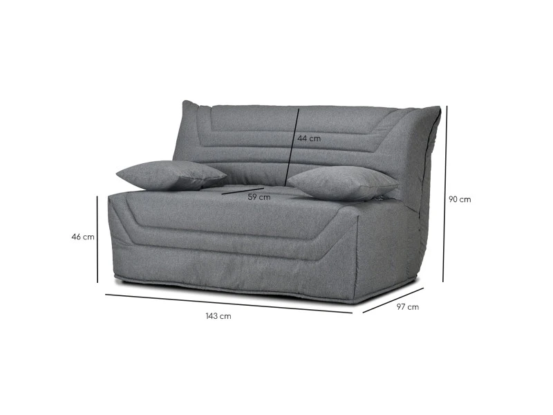 - DIMENSIONS APPROXIMATIVES : Canapé: L.143 cm x P.97 cm x H.90 cm. Assise : H.46 cm x P.59 cm. / Lit : L.140 cm x P.190 cm x H.46 cm.
