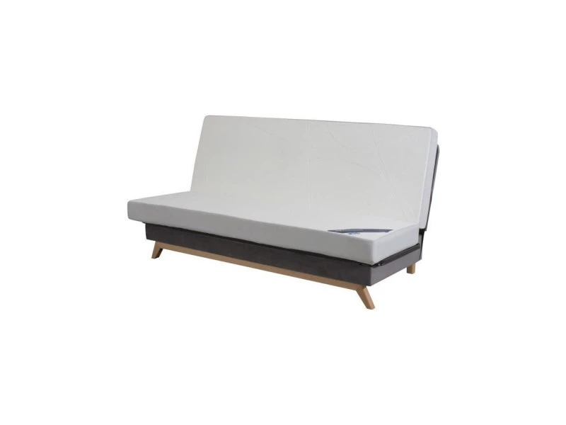 Banquette CC 120 x 190, mat 188×118, SIMMONS 378 ressorts ensachés + mousse polyuréthane 24kg/m3 2cm + feutre 2cm, ht 13 cm. coutil plateau lisse 100 % polyester coutil plates bande 29 % polyester 16 % coton 40 % acrylique chenille 15 % polypropylene. Som 114×185 2×9 lattes multiplis (53×8). Couette ANGEL NOIR ouate de polyester 2×180 gr, 100 % polyester. Structure en panneau de particule & bois massif . Un pied socle devant et deux pieds bois naturel 90 mm